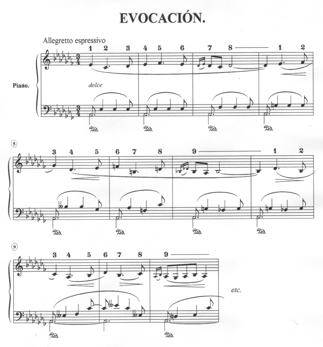 gedehnt ist. Die einzelnen Silben sind in Beispiel 72 durch Ziffern markiert (vgl. „EVOCACIÓN”). Eine zweite